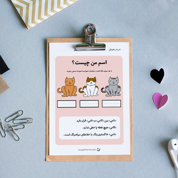 به این گربههای بامزه نگاه کنید! مردم همیشه میخواهند بدانند نام گربهها چیست و این دانشآموزان شما هستند که باید پاسخ این پرسش را بدهند. ببینید آیا کودکان شما میتوانند این توضیحات را بخوانند و تصمیم بگیرند که کدام نام برای کدام گربه است؟ اگر نمیتوانند بخوانند، با خواندن توضیحات با صدای بلند به آنان کمک کنید تا شروع به توسعۀ مهارتهای خواندن خود کنند.