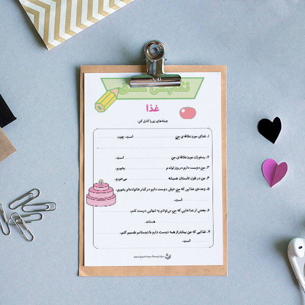 دوست داری در روز تولدت چه بخوری؟ در این کاربرگ نگارش خلاق به این پرسش و چندین پرسش دیگر دربارۀ غذاها پاسخ میدهید! نویسندگان نوپا با پرکردن جاهای خالی میتوانند جملهنویسی را تمرین کنند.