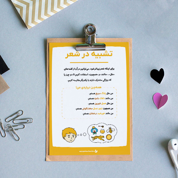 این پوستر به کودکان کمک میکند تا با استفاده از تشبیه، شعری ساده بنویسند. تشبیه شکلی از زبان تمثیلی است که با استفاده از کلمات «مثل»، «مانند» و «همچون» ویژگیهای یک چیز را با ویژگیهای چیزی دیگر مقایسه میکند. با استفاده از این پوستر، دانشآموزان میتوانند پنج تشبیه برای توصیف خود بنویسند.